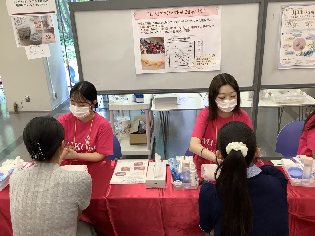 そのほかにも、「薬学部生のハンドサロン」では、現役の薬学部生が武庫女オリジナルの『MUKOismハンドクリーム』を使ってハンドマッサージをご提供いたしました。参加者の方々にはマッサージを受けながら、学生生活をはじめ、さまざまな話題で楽しいひとときをお過ごしいただきました。