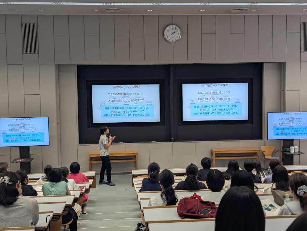 学科説明会では、薬学科長、健康生命薬科学科長より各学科の特徴や卒業後の進路などの紹介がありました。入試制度説明会では、薬学部の様々な入試制度についての説明がありました。そして、現役学生から自身の経験をもとに等身大のキャンパスライフについての紹介が行われました。参加者の皆様にムコジョ学生の日常を少しでも知ってもらえると嬉しいです。