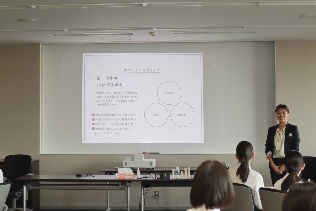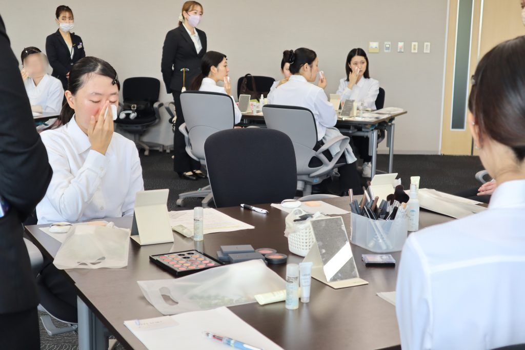 現在、就職活動中の薬学部・健康生命薬科学科 3 年生および薬学科 5 年生、そしてこれから就活に挑む健康生命薬科学科 2 年生が、本学の客員教授である谷先生ならびに株式会社ナリス化粧品様からお招きした講師・アドバイザーの方から、『就職活動で他者から好感を持たれる化粧法』を学び、ビジネスメイクの 5 つの掟を守るためのメイク技術を伝授してもらいました。