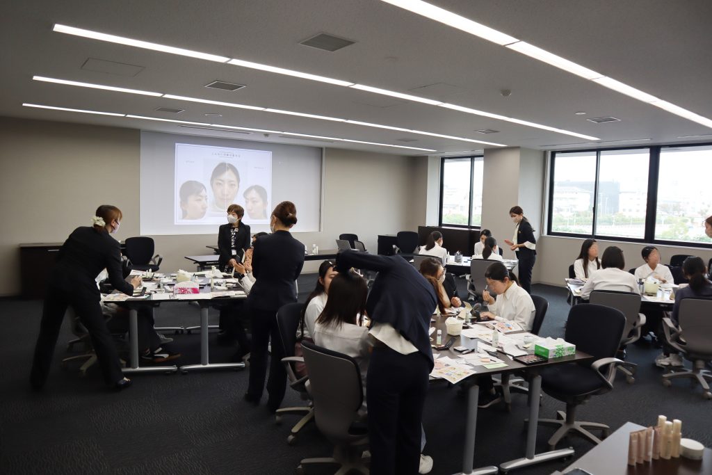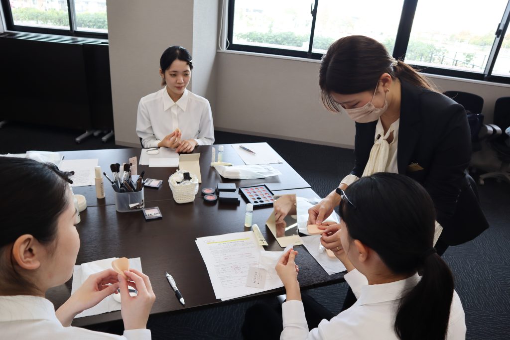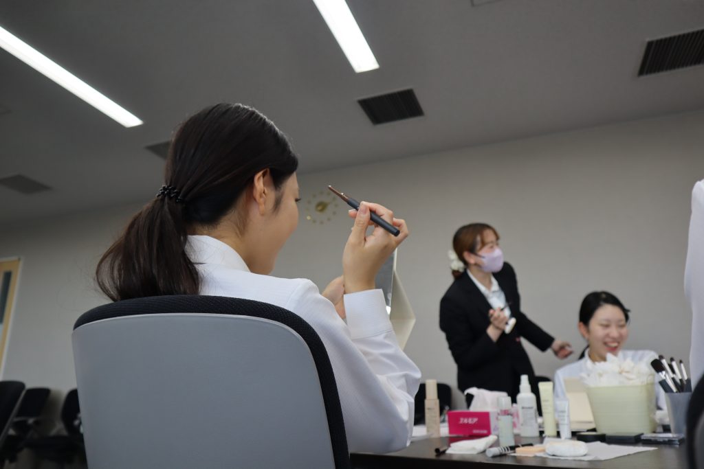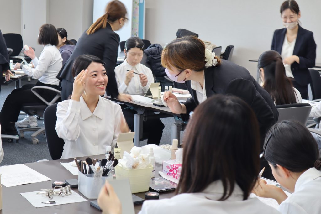 メイクの実践段階では、各テーブルに 1 名、講師の方が付き添ってくださり、眉やアイラインなどに関する細かな点についてもしっかりアドバイスをしてもらい、今後に活かせる技術を習得できました。