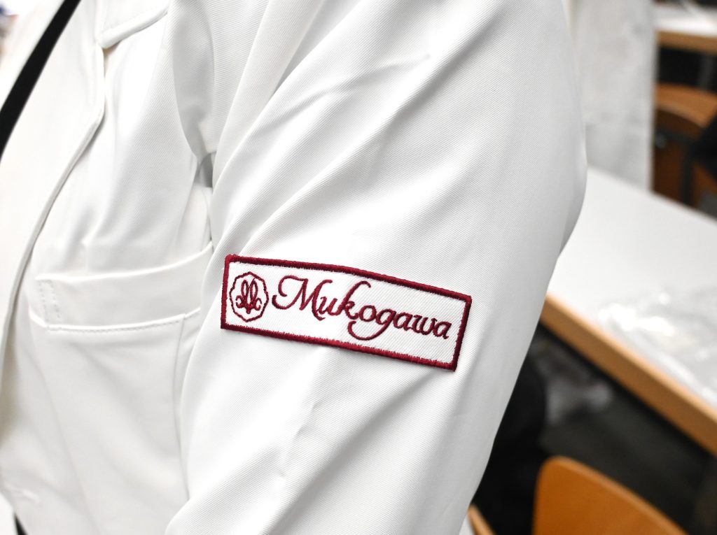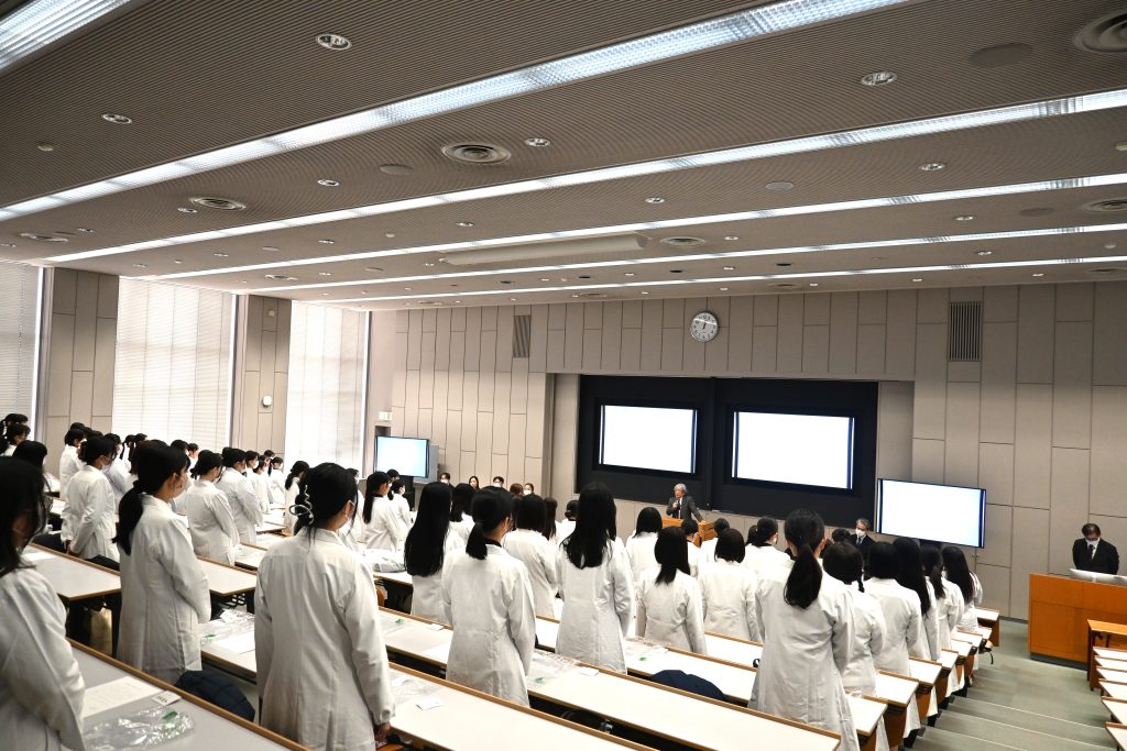 学生たちは、贈呈されたMUKOGAWAのロゴ入りの新しい白衣に身を包み、心得の宣誓を行い、学部長、学科長、各クラスの担任教員からお祝いと激励の言葉を受けました。