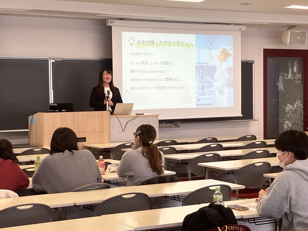 今回は、製薬会社や大学の研究者、公務員(税関)、薬局や病院に勤務する薬剤師6名の先輩が話題をご提供くださいました。ご講演では、仕事の内容や1日の流れ以外に、今の仕事を選んだ理由、就活上で頑張ったこと、お仕事のやりがいなどについても触れていただき、「大学時代に研究室で実験し、その経験から学んだことが今役だっています」など、力強いアドバイスをいただきました。